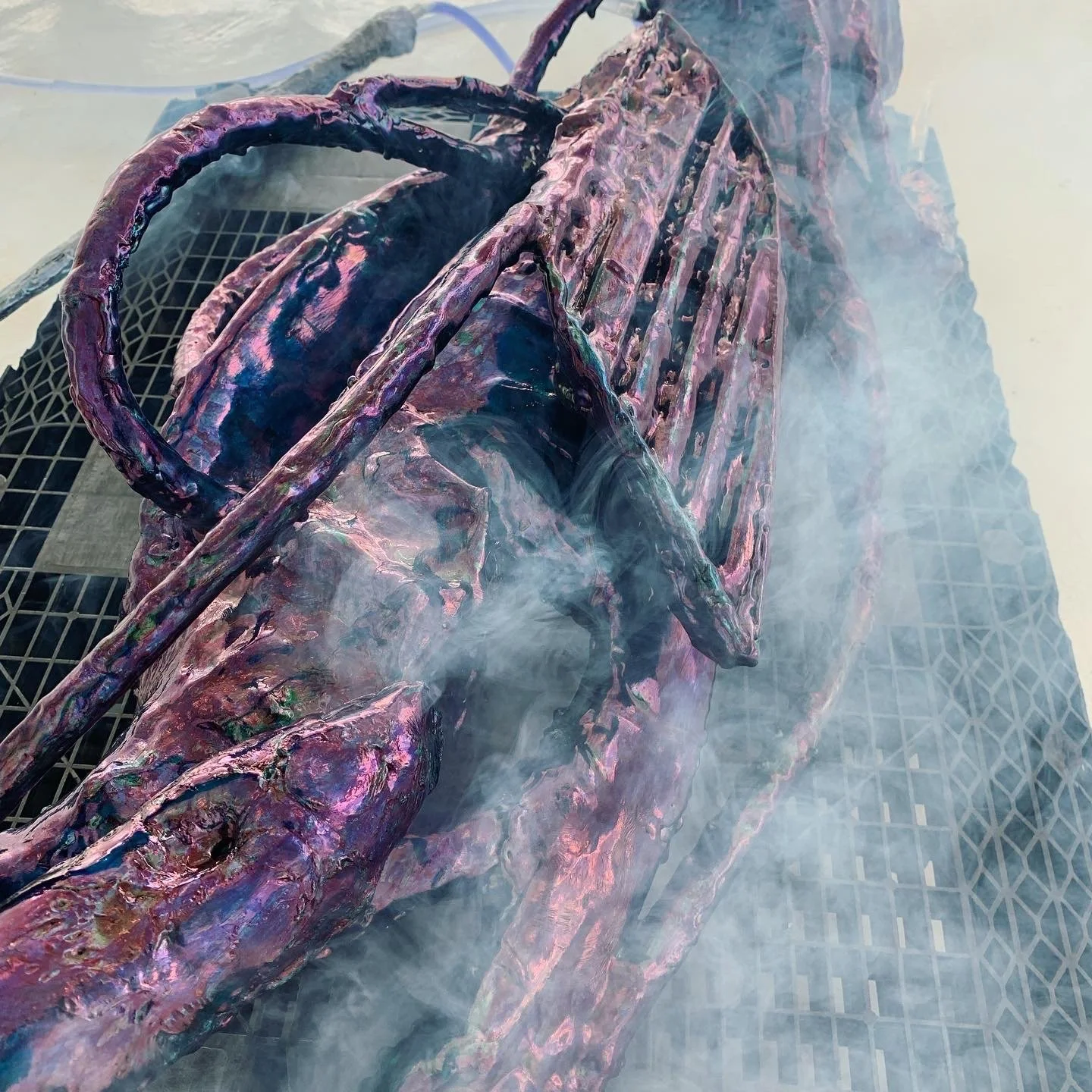 Née d’une fascination pour notre rapport aux produits technologiques qui nous entourent, ma pratique génère des cycles de transformations, avec pour objectif la mutation de ces objets vers des formes communément fictives entre vivant et machine, invoquant par ce biais des influences S-F évidentes. Mes installations ouvrent un portail entre réalité et fiction, matérialisant des jardins de formes prédatrices à l’image de nos modes de vie et de nos sources de divertissements de plus en plus ancrés dans nos corps et dans nos pensées. Ces formes tentaculaires, ces dispositifs cadavériques proposes des systèmes mutants, des corps dispersés, ou évoque une technologie défaillante et inerte qui n’aurait jamais dû exister. Ces sculptures deviennent un reflet fantasmagorique et sombre de nos équipements, nos techniques, nos machines, qui normalement par fonction, nous procurent sécurité et confort en agissant comme un médicament vis-à-vis de notre vulnérabilité corporelle.