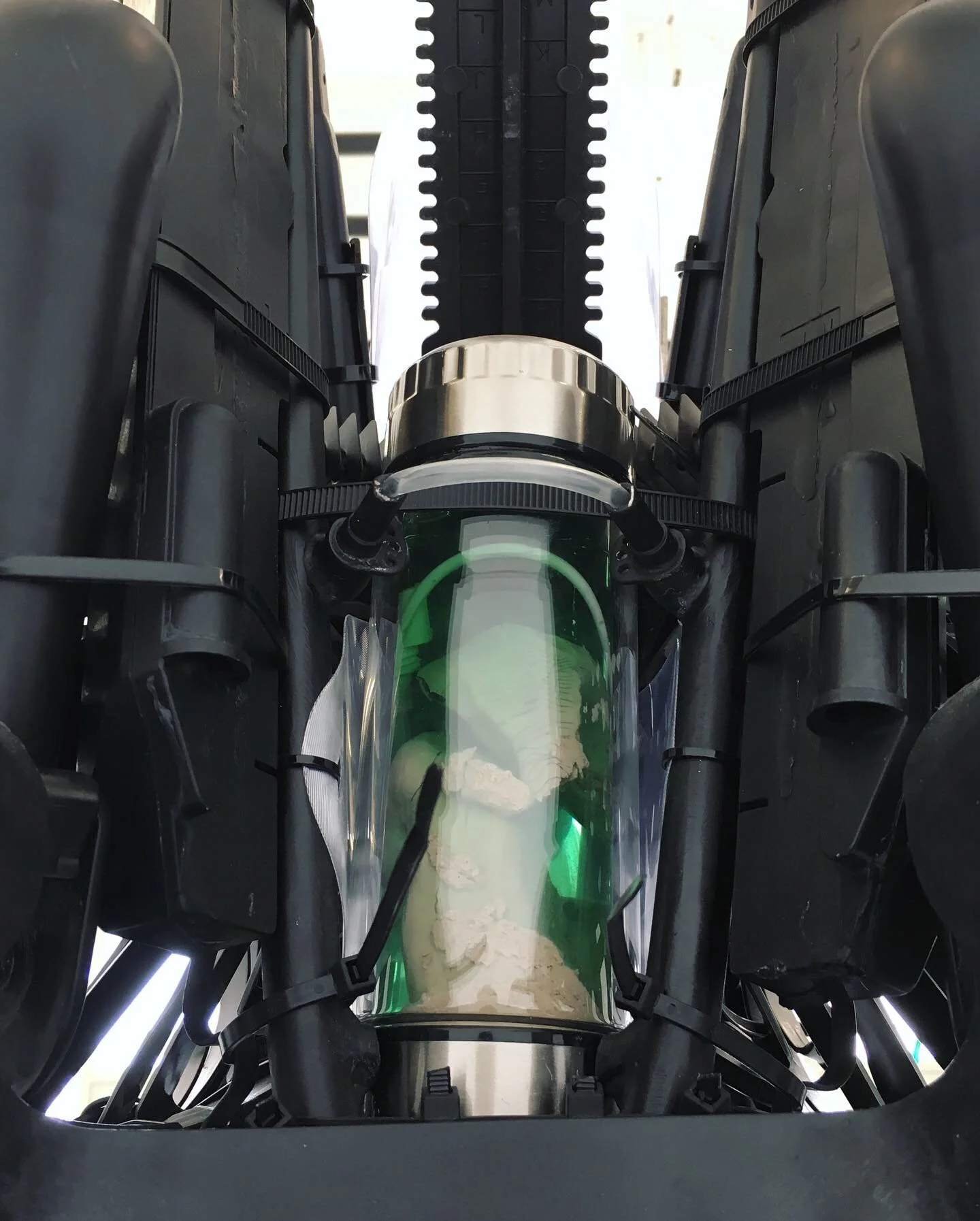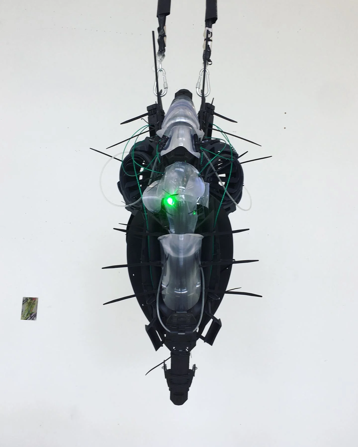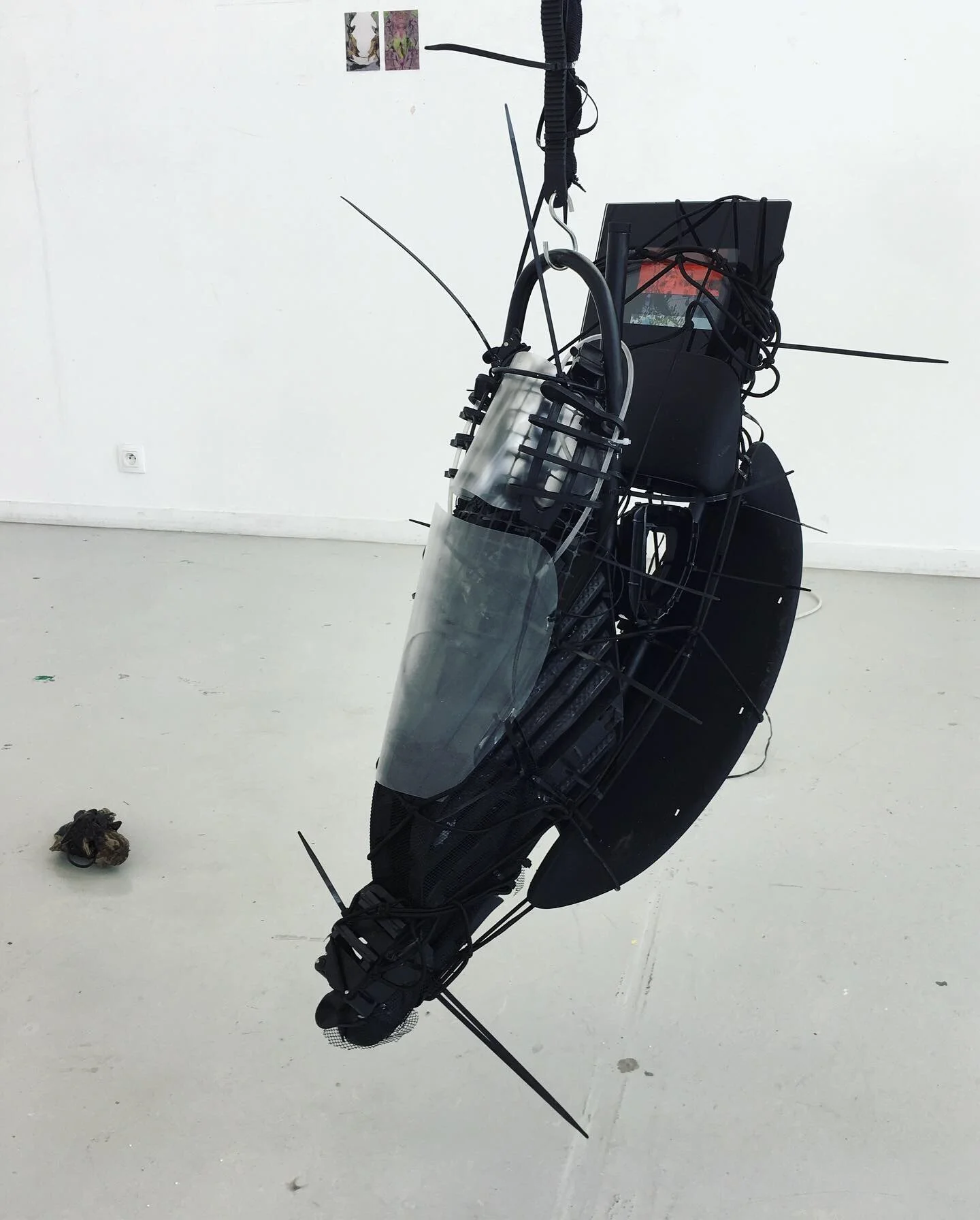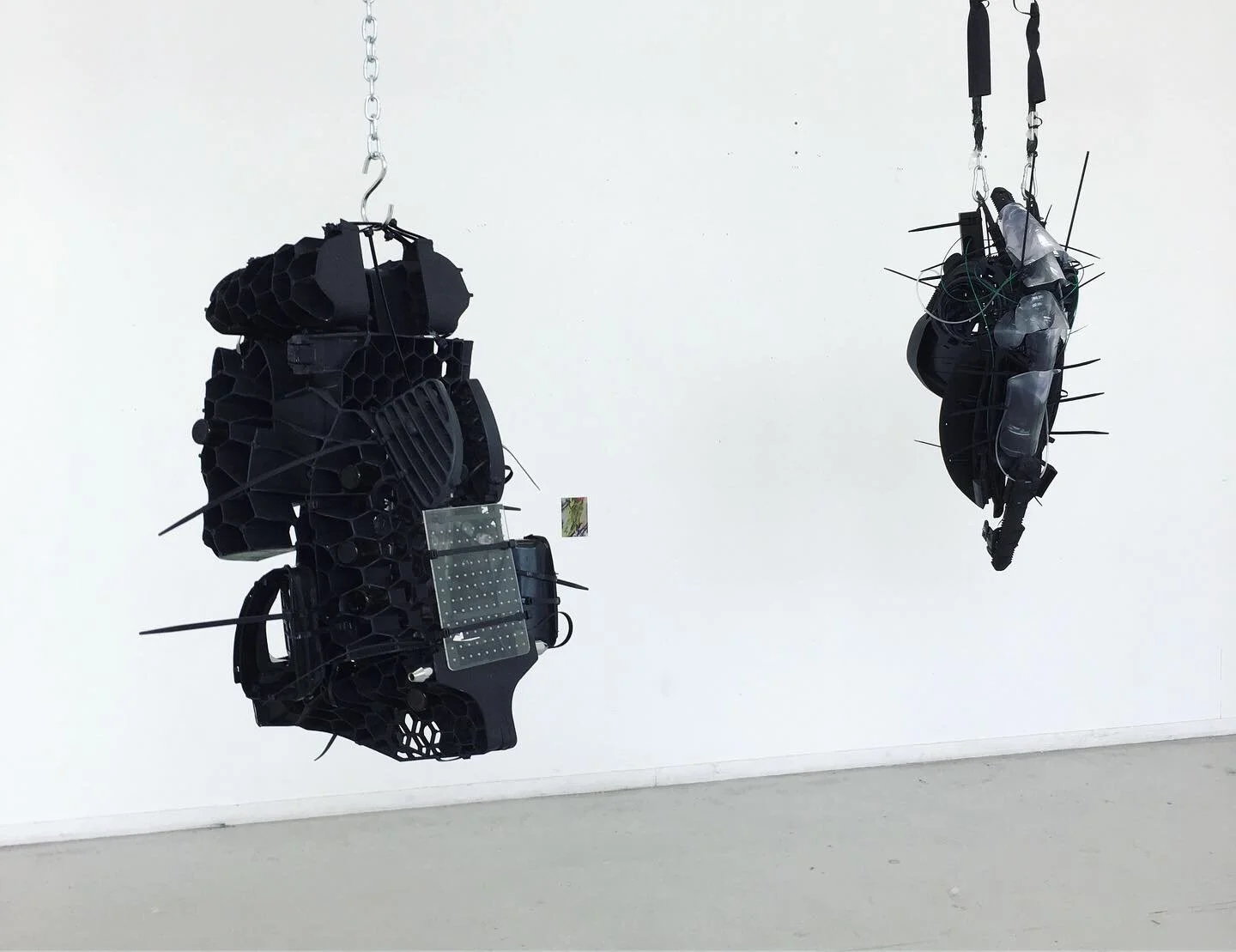 L’espace blanc n’est plus vide... Des systèmes clandestins investissent le « white cube » qui semble s’être ici transformé en un showroom clinique d’armement futuriste. Laboratoire ou exposition, ces totems autoritaires viennent créer une distance froide avec tout spectateur, poster en sentinelles immobiles, ces formes proposent un reflet perturbant des entités technologiques qui nous bercent au quotidien, et à la place que nous leurs donnont vis-à-vis de nos corps.